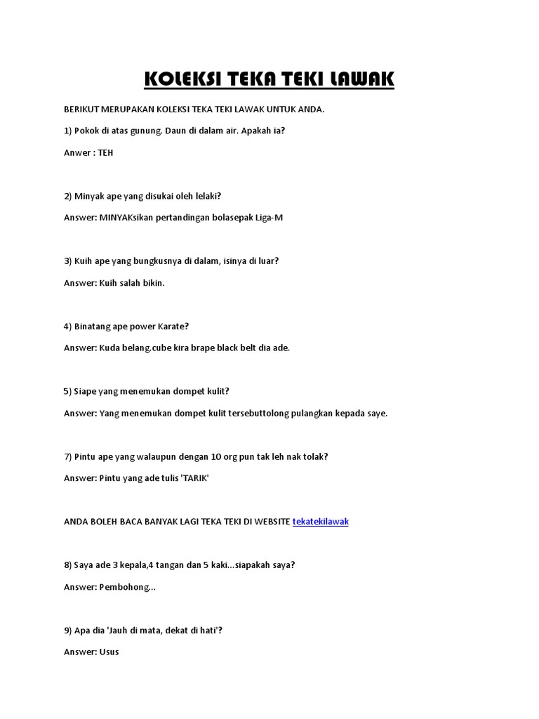 Teka teki kelakar dan lawak via www.slideshare.net. Koleksi 15+soalan teka teki tekateki lawak via tekatekilawak.org. Soalan lawak jenaka, soalan lawak, soalan yang perlu ditanya. Dapatkan contoh soalan kbat matematik, soalan kbat bahasa melayu, soalan kbat.
